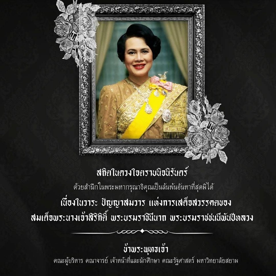 ขอแสดงความอาลัยอย่างสุดซึ้ง เนื่องในวาระการเสด็จสวรรคตของ สมเด็จพระนางเจ้าสิริกิติ์ พระบรมราชินีนาถ พระบรมราชชนนีพันปีหลวง ขอถวายความอาลัยและน้อมรำลึกในพระมหากรุณาธิคุณอันหาที่สุดมิได้ ที่ได้ทรงประกอบพระราชกรณียกิจนานัปการ เพื่อความผาสุกของพสกนิกรชาวไทย และการพัฒนาชาติไทยในทุกมิติ ปวงข้าพระพุทธเจ้าคณะผู้บริหาร คณาจารย์ บุคลากร และนักศึกษา คณะรัฐศาสตร์ มหาวิทยาลัยสยาม ขอน้อมเกล้าน้อมกระหม่อมรำลึกในพระมหากรุณาธิคุณเป็นล้นพ้น ตราบนิรันดร์